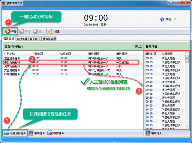 1、全天候自动定时播报,事先规划好的促销内容都在这里。