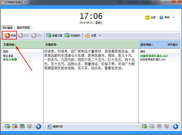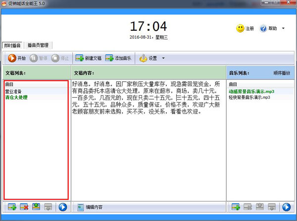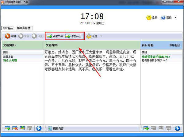 7、在播音过程中可以创建新的播音稿,可任意切换播音内容和背景音乐,整个播音过程完全由您掌控,随心所欲
