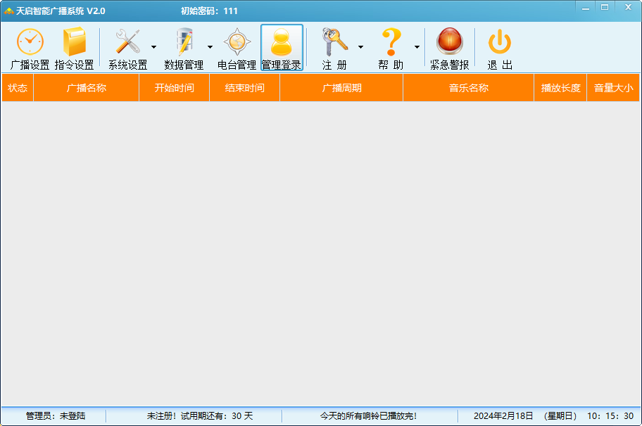 天启智能广播系统官方版是一款集智能广播和考试指令播放于一体的应用软件,主要提供了广播设置、指令设置、系统设置、数据管理、电台管理、登录管理及紧急警报等应用模块,可将mp3、wma、mid等音乐文件作为每天播放的广播铃声进行设置,为用户提供了灵活而全面的使用体验。