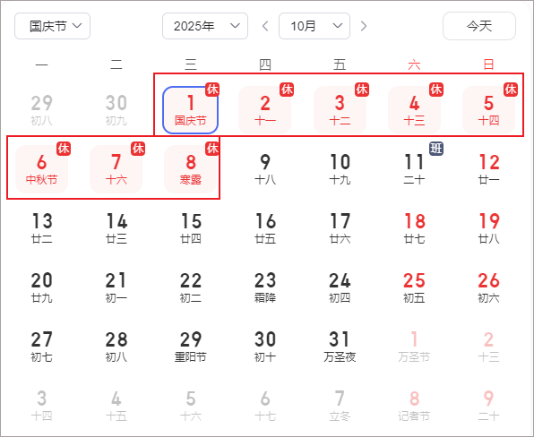 10月1日(周三)至8日(周三)放假调休,共8天。9月28日(周日)、10月11日(周六)上班。