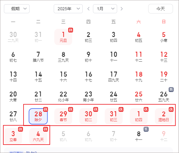 1月28日(农历除夕、周二)至2月4日(农历正月初七、周二)放假调休,共8天。1月26日(周日)、2月8日(周六)上班。