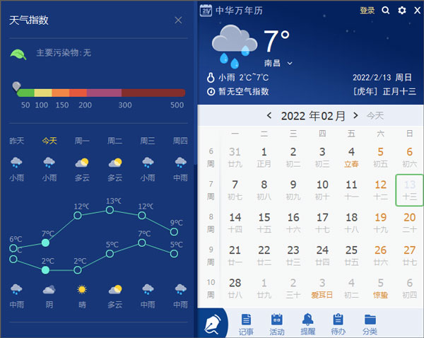 中华万年历电脑版是针对PC端而设计的一款日历显示软件,具备日程提醒,数据据云同步,生知点滴记录,大小节日预报等全新功能,让你可以真正地把握住时间,打造出专属于自己的日历。该软件体积小巧,界面简洁,经典周月历切换,经典大屏日历与高效简约日历随心切换,全新视觉设计,自定义主题想换就换,还可查询国内各个城市的天气,支持天气背景随天气变化,提供空气质量、灾害预警等全方位信息。同时除了基本的公历、农历、黄历查询功能外,软件还集成了记事本、自定义节日、任务、星座运程、天气、周公解梦、生理节律等实用工具,是目前最好用的日历软件。另外,中华万年历还拥有网页版和手机版两种版本,可满足不同用户的需求,感兴趣的朋友欢迎下载使用。
