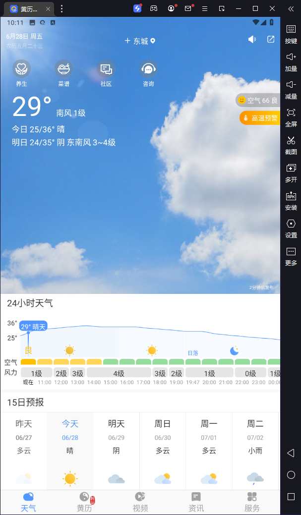 黄历天气电脑版是借助于模拟器运行的首款结合天气与黄历功能的免费查天气软件,主要围绕着天气、万年历、黄历三大主要模块运行,除了能够查询天气、农历、日历、个人运势、吉神方位等各项日常功能,还提供了中国传统黄历现代文宜忌功能,是目前非常畅销的日历天气神器。并且,黄历天气已经全面支持3000多个城市,对经常出远门、旅行、出差的朋友来讲绝对是最佳的选择。有需要的小伙伴可以在本站下载使用~