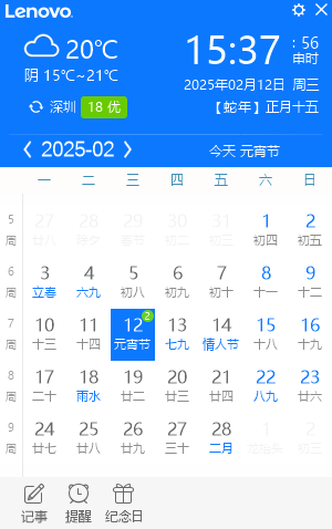 联想日历电脑版是一款非常优秀的电脑日历应用,能够帮助用户记录各种重要的日期,比如朋友生日、会议日期、要做的事情以及航班时间等等。当然除了记录一些事情以外,还具备了日历、天气、闹钟、云同步、分享等多项实用功能,助用户在操作时更加便捷。而且软件不仅会为用户们提供天气预报,多城市天气定制,自动更新天气、空气指数以及未来六天天气情况,还将公历、农历和干支历三历对应,假日节气查询,国家法定放假安排查询,随时记录生活中重要的事情和工作安排,界面很漂亮,可以网络校时,操作简单,小巧不占用系统资源。