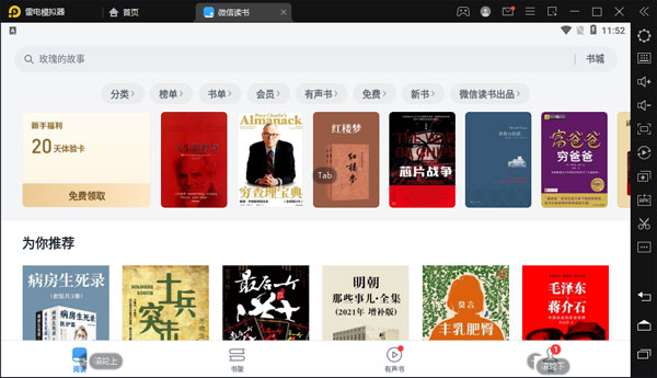 微信读书电脑版是借助安卓模拟器而在pc端上运行的一款电子阅读工具,可以提供海量的电子书资源,包括了精品小说、人物传记、社会文化、历史、哲学宗教、个人成长、艺术心理等等分类,满足不同人群的阅读需求,会根据用户的阅读历史和兴趣智能推荐相关书籍,节省用户大量找书的时间,在阅读体验上拥有多种不同的模式可以选择,还可以自定义字体、间距、翻页等功能,让你以最舒服的习惯来进行阅读。除此之外,微信读书还有着听书功能,每本书籍都能够支持有声阅读,解放眼睛,适合用户可以在做其他事情的时候听书,对此有兴趣的小伙伴可以来下载体验。