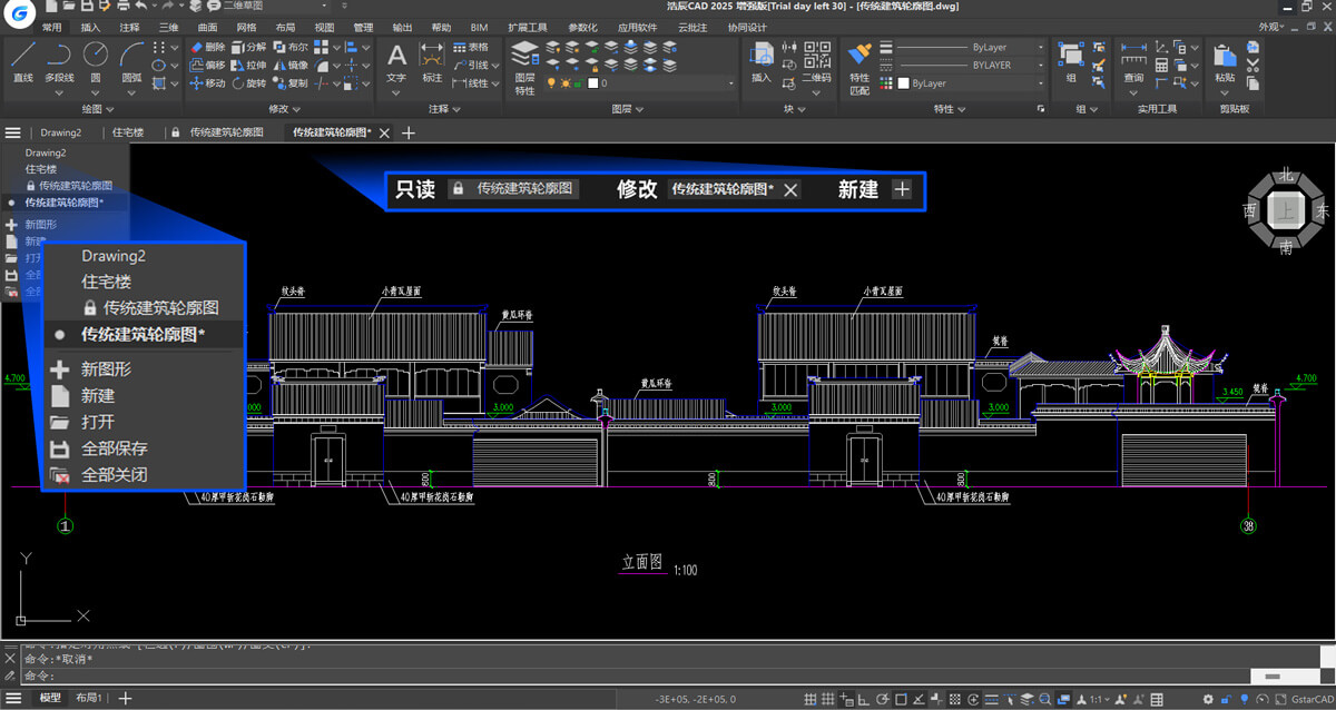 文件标签栏增加“新建和列表”按钮,能够更便捷的完成文件相关处理,增加了锁定和被修改的提示,可以更清晰显示和区分文件的状态;同时优化了外观和显示方式,适度放大了绘图空间。