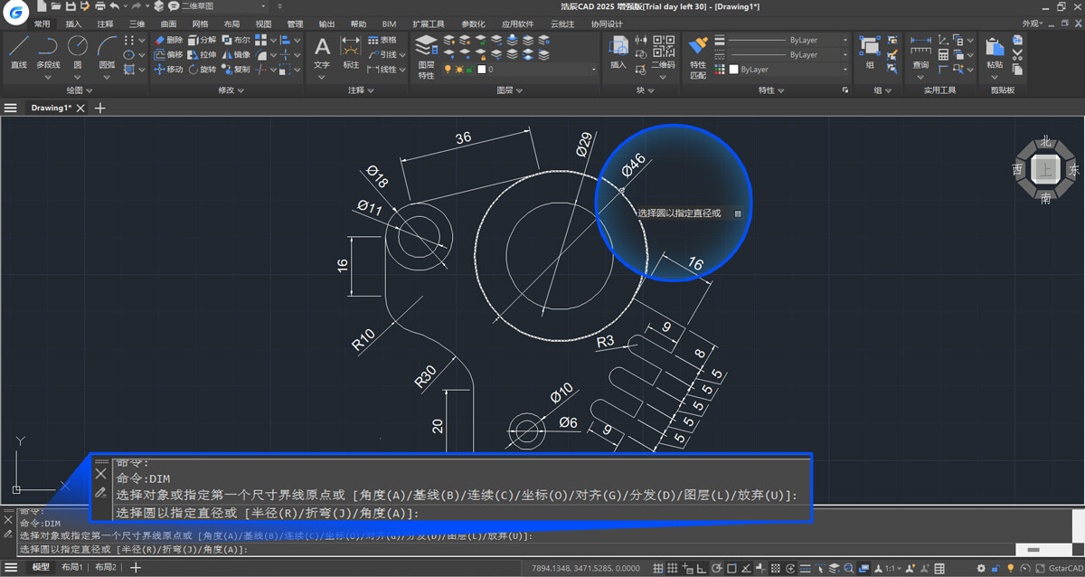 智能标注(DIM)功能支持根据图形对象自动创建对应标注类型,根据标注预览可以评估所需的尺寸、角度等结果,用户无需频繁切换不同的标注命令,大大简化了标注流程,提高绘图速度。