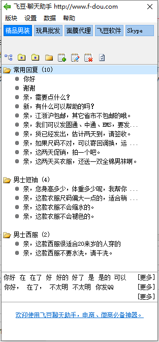 飞豆聊天助手最底部还设有三行快捷语句,单击就发送出去,特别适合用到频率极高的短语,如:你好,有什么可以帮到你的吗?好的,可以的,不能哦等等