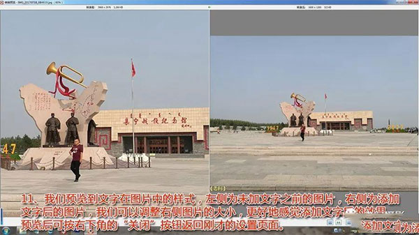 11、我们预览到文字在图片中的样式,左侧为未加文字之前的图片,右侧为添加文字后的图片,我们可以调整右侧图片的大小,更好地感觉添加文字后的效果。预览后可按右下角的“关闭”按钮返回刚才的设置页面。