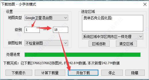 3、接下来我们点击图形设置界面的"下载该区域地图"选项,进入到下载地图的界面,这里我们需要设置地图的类型、级别等,设置完成后再点击“开始下载”;