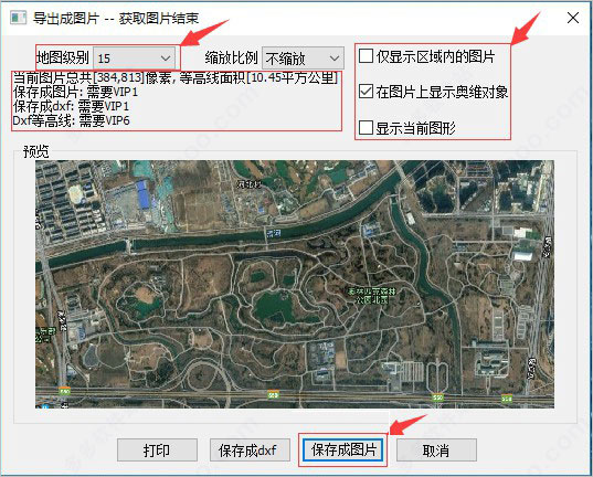 5、再进入到导出成图片的界面,接下来我们先设置地图的级别以及界面右侧的其它选项,设置完成后点击界面下方的"保存成图片"选项;