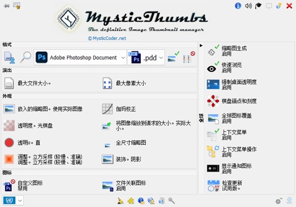 MysticThumbs(PSD缩略图补丁)是Microsoft Windows上的一款非常实用的图像缩略图生成器,能打开最流行的文件格式的缩略图和快速查看支持窗口文件资源管理器!当资源管理器显示受支持的文件(通常是图像)类型的缩略图时,它会插入 Windows 资源管理器并在后台进程需要时生成缩略图和小文件图标。因此,大多数时候您所要做的就是安装它,然后您就可以立即开始接收图像的缩略图,有时还有其他文件类型。