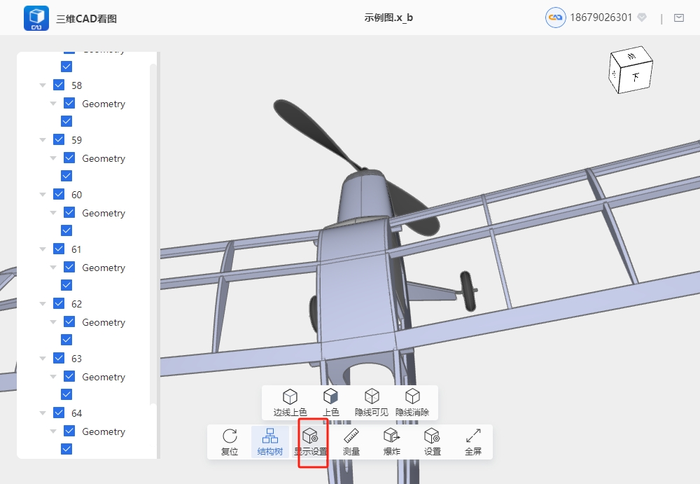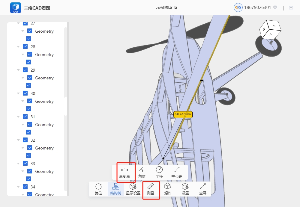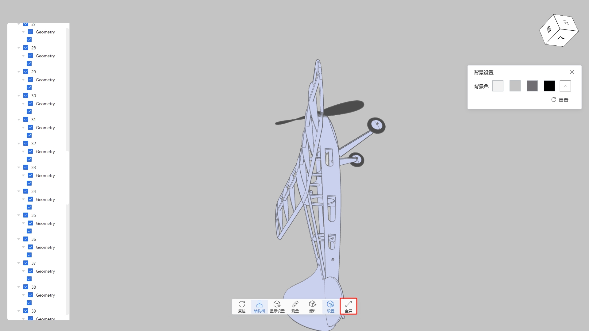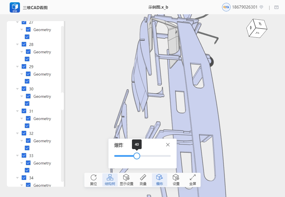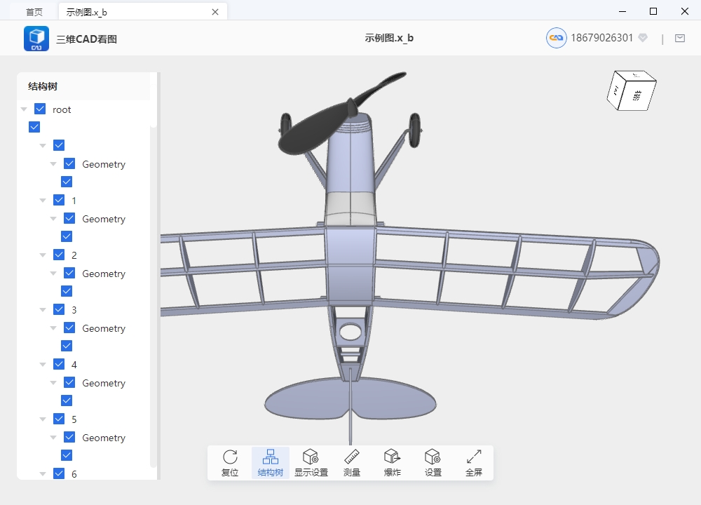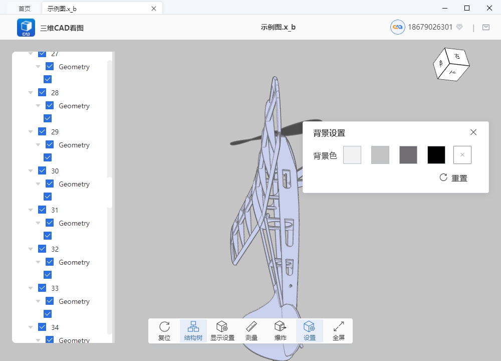 2、打开之后,里面为用户提供了复位、结构树、显示设置、测量、爆炸、设置、全屏等功能,在结构树中,用户可以看到整个模型的结构,你也可以任意拨动模型;