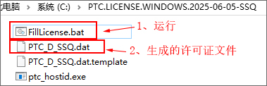 2、先将_SolidSQUAD_激活文件解压出来,再将文件夹“PTC.LICENSE.WINDOWS.2025-06-05-SSQ”复制到临时目录并运行“FillLicense.bat”,生成许可证文件PTC_D_SSQ.dat;