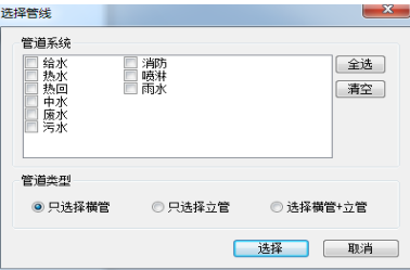 2、选择管线:可以对某个系统的管线及立管进行批量选择。可以对某个系统进行仅选择立管或者仅选择横管、也可以选择立管+横管(三种模式任选其一)。