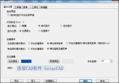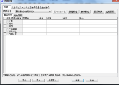 【选项配置】命令是管理软件全局配置参数,包括图层标准设定、文字样式、尺寸样式设定以及高级选项卡。