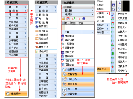 采用折叠式工具箱菜单界面,集成软件所有功能,分类清晰、操作高效、允许个性化定制。界面图标使用了 256 色,提供了“建筑设计”等多个菜单可供选择,支持鼠标滚轮快速