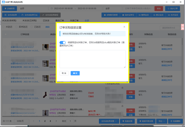 3、将对应的商品链接复制进文本框中;并做选择是需要根据商品ID关联订单还是根据商品的SKU编码关联订单,若需要将同商品订单覆盖此链接 需要采购后重新同步订单 具体同步规则在设置采购链接页面的勾选项