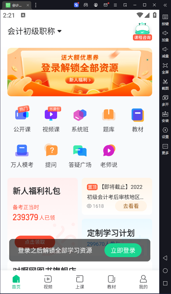 会计随身学电脑版是借助于模拟器运行的一款针对会计从业证考试的学习软件,拥有会计基础、财经法规、会计电算化等多个免费视频,同时同步全国会计从业资格证考试官方教材;支持视频学习、题库练习、讲义阅读、难点答疑、直播公开课五位一体,可以帮助用户更好的学习和复习会计,从而轻松通过考试。