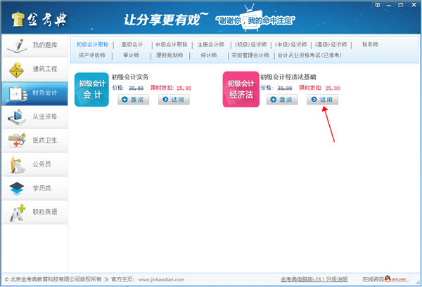 包含建筑工程类、财务会计类,从业资格类,公务员等数百个科目,用户都可以在金考典官网下载免费试用,永久免费升级,软件通过主流杀毒软件权威认证,安全可靠。