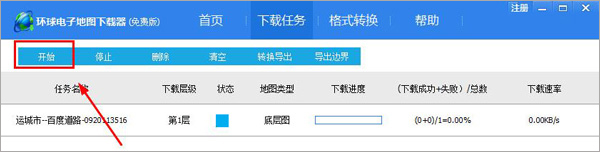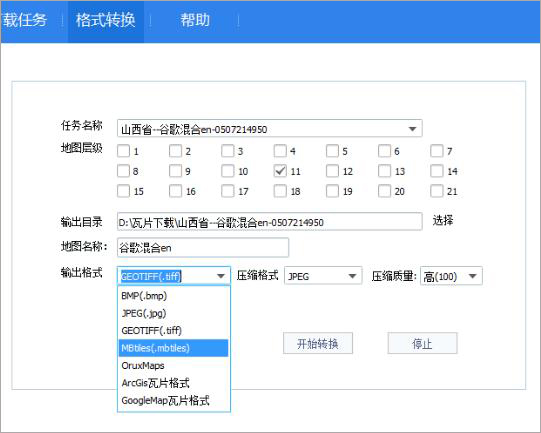 地图下载完后,在下载任务窗口选择“格式转换”按钮或直接切换到格式转换窗口。然后选择要转换的任务名称、输出格式、输出目录等,点击开始按钮进行转换。