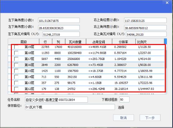 第三步:选择下载层级。选择下载范围后,双击选中的范围,跳出下载选中窗口。选择需要下载的层级、文件保存路径、修改下载线程数等点击下一步。