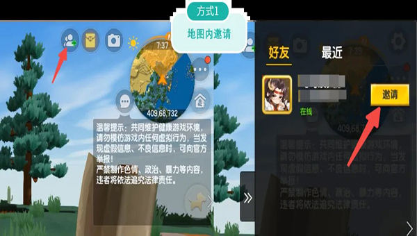 使用“打开地图”进入地图后,可以在地图内邀请好友进来一起玩,也可以让朋友在好友界面中点击地图,可以直接进入地图。