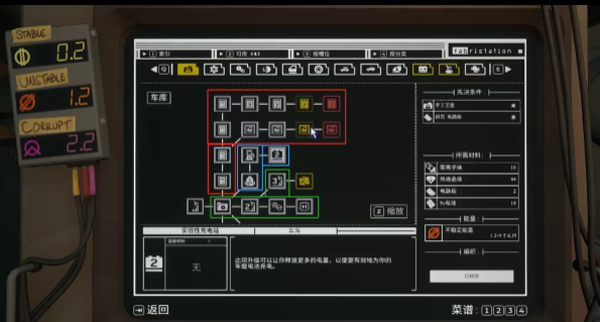 蓝色框为服装站,快速加油和充电更多;服装站需要的资源很多,前期点小背包,其他中期点;快速加油和充电更多等车有大油箱和大电池后点