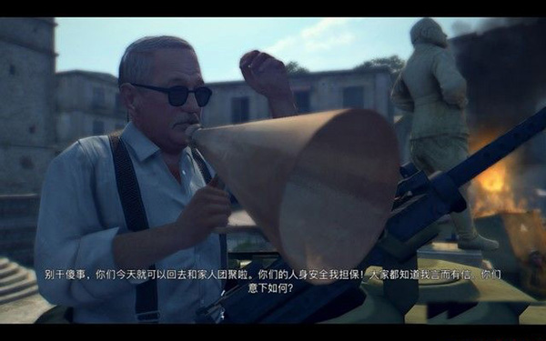 而图中这个喊广播的老头就是一个黑帮大佬,大佬一出现,守军就投降了。