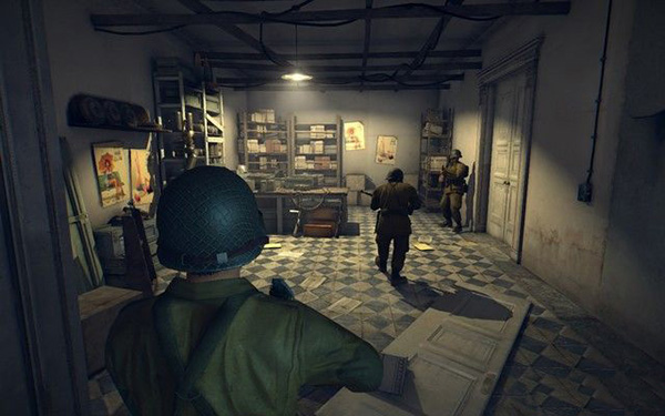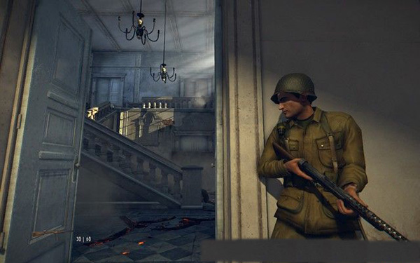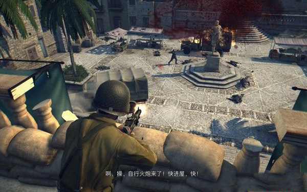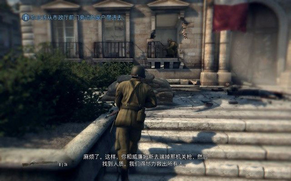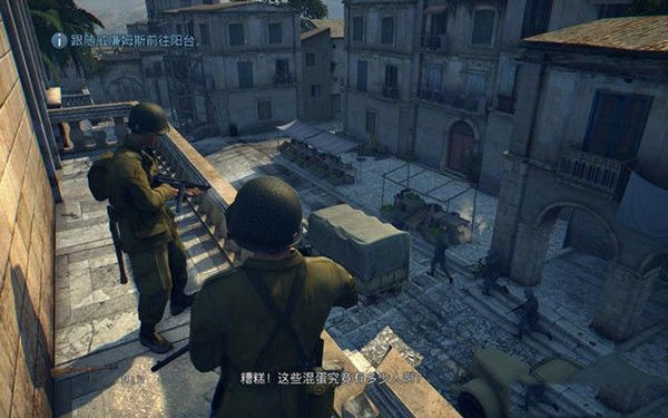 去房间的阳台,架起MG42机枪,这种重机枪射速非常快,可以非常高效地打击敌人,不过,因为敌人数量很多,你很容易受到伤害,可以将下面的卡车射爆,炸死敌人。