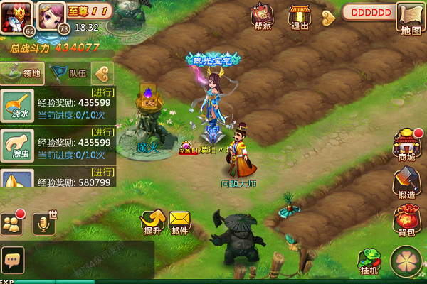 4、帮派任务:进入领地后就可以完成日常的帮派任务了。主要围绕着种植、敌方入侵、守卫神树、窃取果实等类型,完成后都能获得经验、帮贡、道具等丰厚收益。