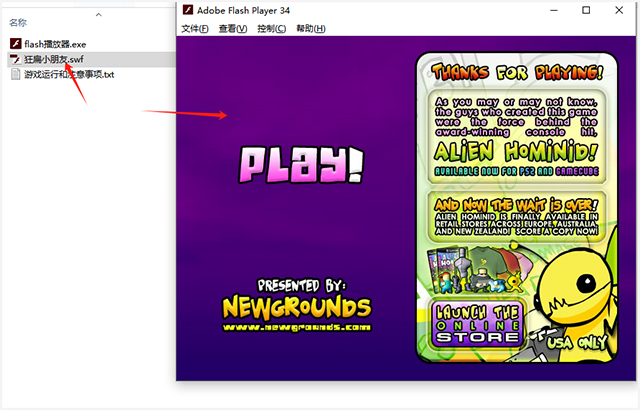 2、随后将“狂扁小朋友.swf”这个文件拖动到刚刚打开的flash播放器中即可