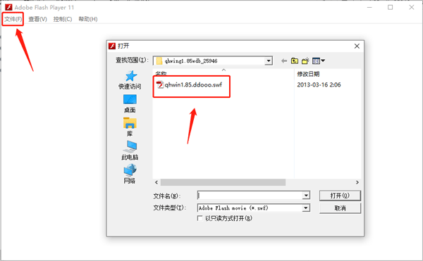 3、或者 将“qhwin1.85.ddooo.swf”文件直接拖动到flash播放器上也行。
