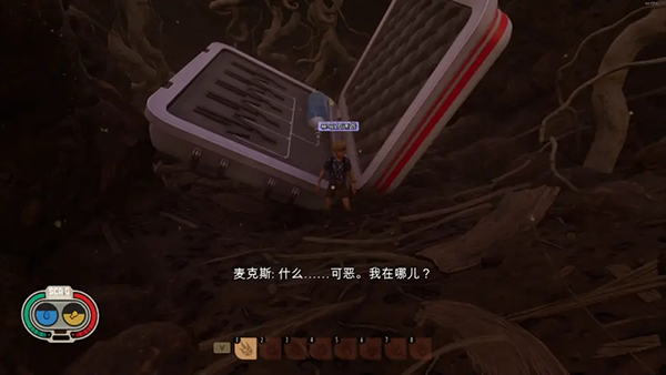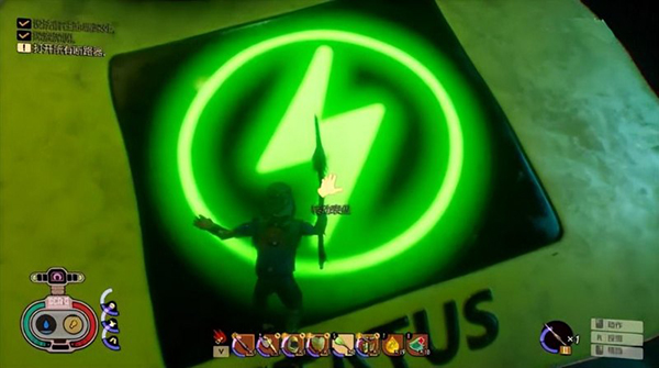 6、游戏随处有很多卡带,有那种不带彩虹颜色的可以给机器人,让他插脑壳里解锁升级项,目前就遇到过3个,位置忘了,有一个是在机器人旁边,注意看地上。