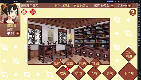 《女帝的日常》电脑版是一款基于安卓模拟器运行的古风模拟养成游戏。画面精致唯美,经典古风设计让人仿佛置身于古代皇宫。玩家可以扮演女帝,体验执政、政务处理、后宫管理等多种玩法,自由选择不同路线,结果也大不相同。游戏中还有灯会等特色活动,与平民角色互动获取资源或人才。