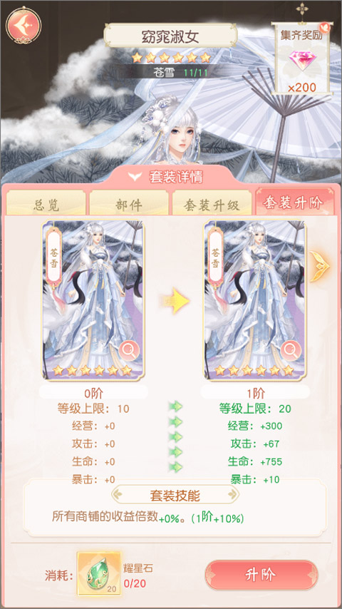 套装升级需要消耗分解获得的材料,套装等级根据当前阶数变化,套装升级可以提升掌柜势力,套装升阶除获得势力加成外,还可额外解锁套装加成。