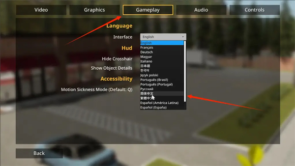 2、接着选择Gameplay,找到language语言设置,下拉选择简体中文即可。
