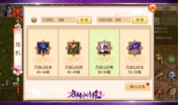 在界面下方,还可以便捷地领取道心试炼任务(道心试炼在20级开启,挂机是完成道心试炼的重要途径哦)。