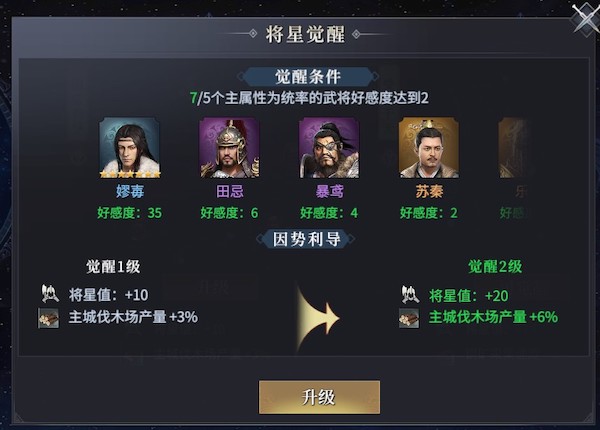 将星组合可以持续进行升级,获得重复的武将或进阶了兵法之后,达成更高级组合的条件,进行升级便可以获得更高的城池收益。