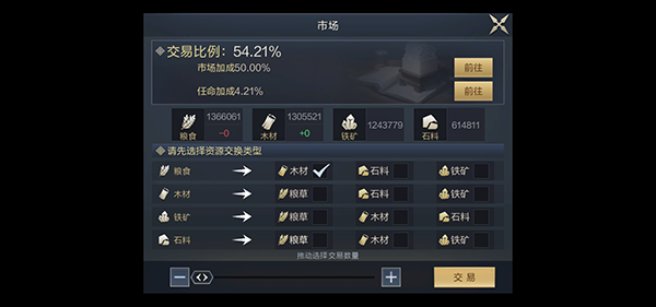 市场玩法在主公府8级之后可以通过建造市场解锁,解锁之后玩家可以将自己仓库中多余的资源转化成缺少的资源。但是这种转化有一定的百分比,比如2级市场1万的粮食只能转化成5000的石头,转化比为50%,不过,随着市场等级的提升,以及商贸官的任命,转化百分比会越来越高。
