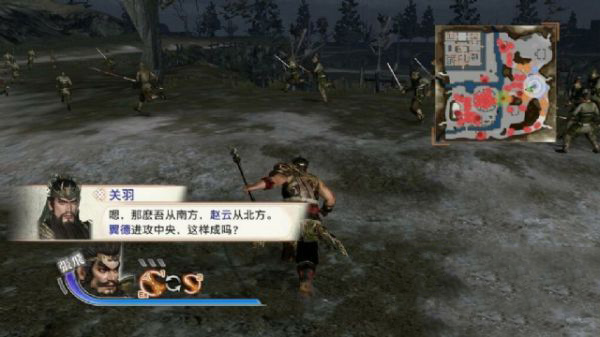 在半路会触发关羽的剧情,二爷表演一招双杀给赵云加经验
