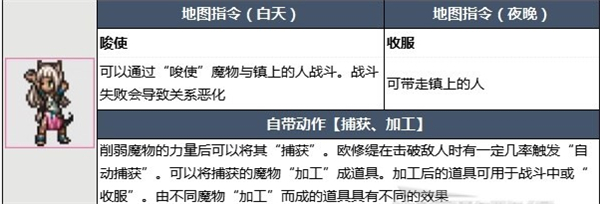 物理型高伤角色,打法简单易懂,可以作为前期优秀的输出角色,可以使用地图指令与NPC进行战斗,打赢就能学习对手的技能。根据习得的技能可以衍生出许多的流派和玩法,最多可以通过这种方式习得5个技能(之后再学需要从当前的5个技能中选一个替换掉)。潜力对敌方单体和全体有很高的收割能力。没有道具收集类的指令,是战斗特化型角色。