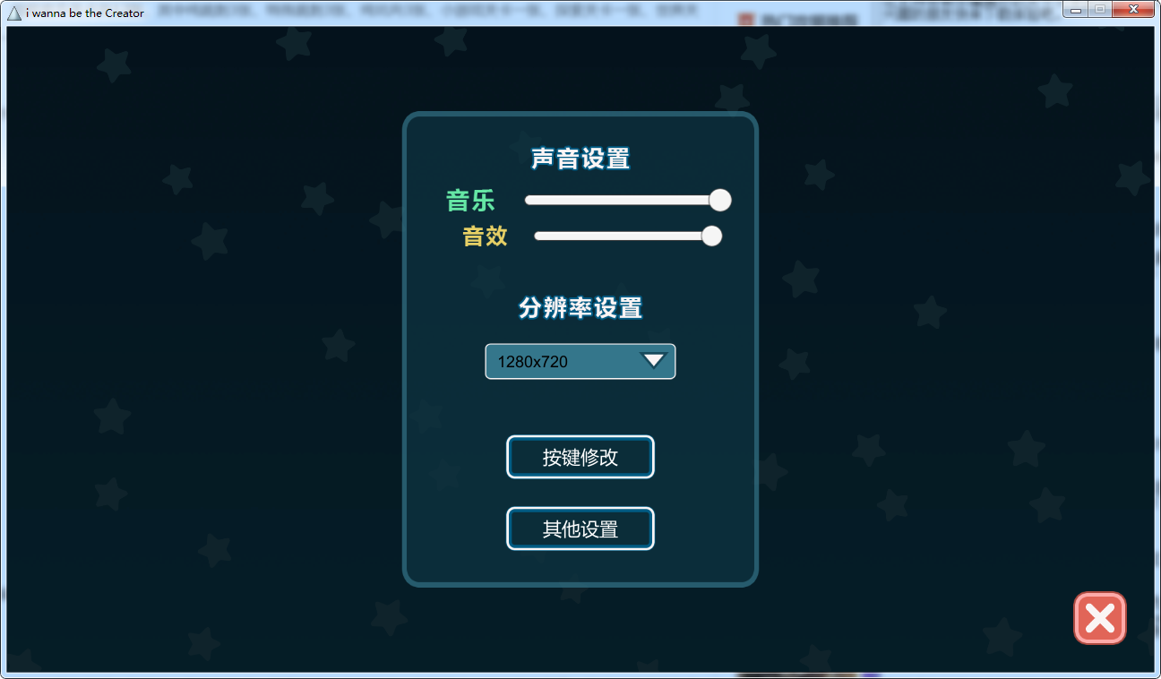 1、进入我想成为创造者pc版游戏,运行游戏并点开设置,支持你设置音乐、音效、分辨率等;