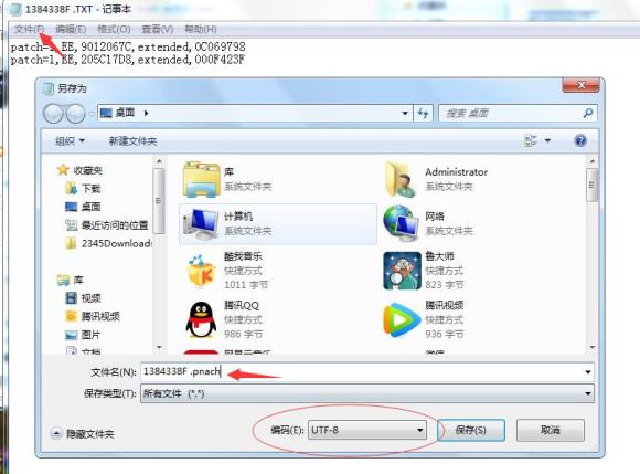 9、我按箭头顺序来说:第一个箭头点击文件,然后找到另存为,会跳出一个界面,之后第二个箭头把后缀名改成 pnach 保存类型那里一定要改成所有文件,最后我画圈的那个一定要改成UTF-8 之后保存,保存后之后找到你刚做好的金手指把他复制到这里,请参考下图