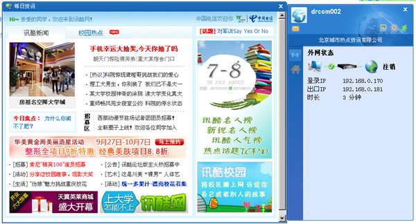 用户在安装客户端的时候,需要根据具体情况进行设置,也就是学校分配IP地址,正常安装完软件后,用户不仅可以正常的进行网络通信,也可以访问校内多种数字信息资源,如:图书馆数字电子图书、考试系统在线题库资源、校园热点等等,从而大大丰富同学们的业余生活。