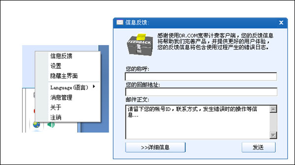 8、客户端图标,右键信息反馈功能。主要可以把用户遇到的问题和建议发送给管理人员;