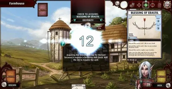 2、未来之力:任意时刻需要掷骰子时,你可以选择激活此技能,弃掉自己牌库中的顶端一张,如果该卡是一张祝福牌(可以强化,变成祝福+法术),则不会弃掉,依然拿回自己牌库中。