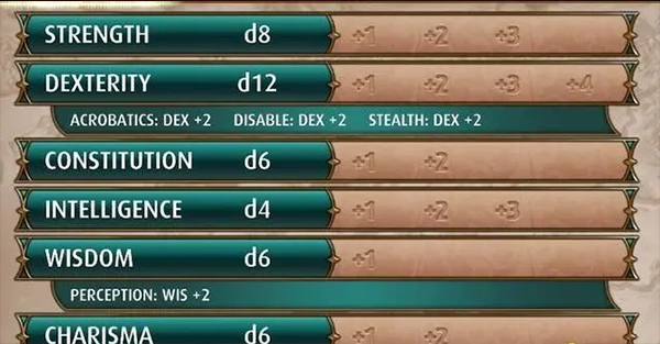 可以看到这个职业敏捷有很大优势,d12平均是6.5,而智力就堪忧了,d4平均只有2.5.