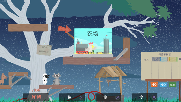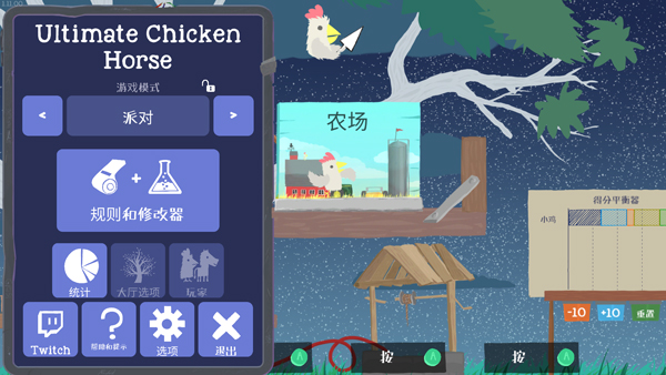超级鸡马电脑版是一款极富创意的动作冒险游戏,英文名叫Ultimate Chicken Horse,游戏采用手绘卡通风格设计,色调温暖清新,第一眼给人感觉就十分舒服,主角是一只小鸡和一匹小马,当然还有其他的小动物在后期可以解锁。