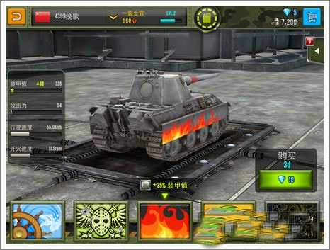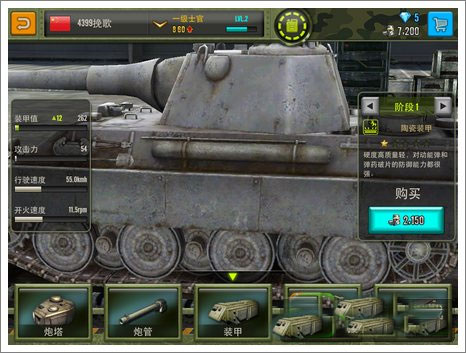 游戏中玩家对于所拥有的坦克可以进行升级改造,坦克的炮塔、炮管、装甲、引擎、履带全都可以改装,而且改装属性显示的十分准确和专业化。如装甲值、攻击力、行驶速度、开火速度的精确体现,还有改装类型的介绍,像引擎改造第一阶段时涡轮汽轮机的具体介绍,炮管改造第一阶段时滑膛炮的详细分析等等。都让军事迷们有一种专业性的感觉,同时也让许多像挽歌这样的爱好玩家有种不明觉厉的感觉。
